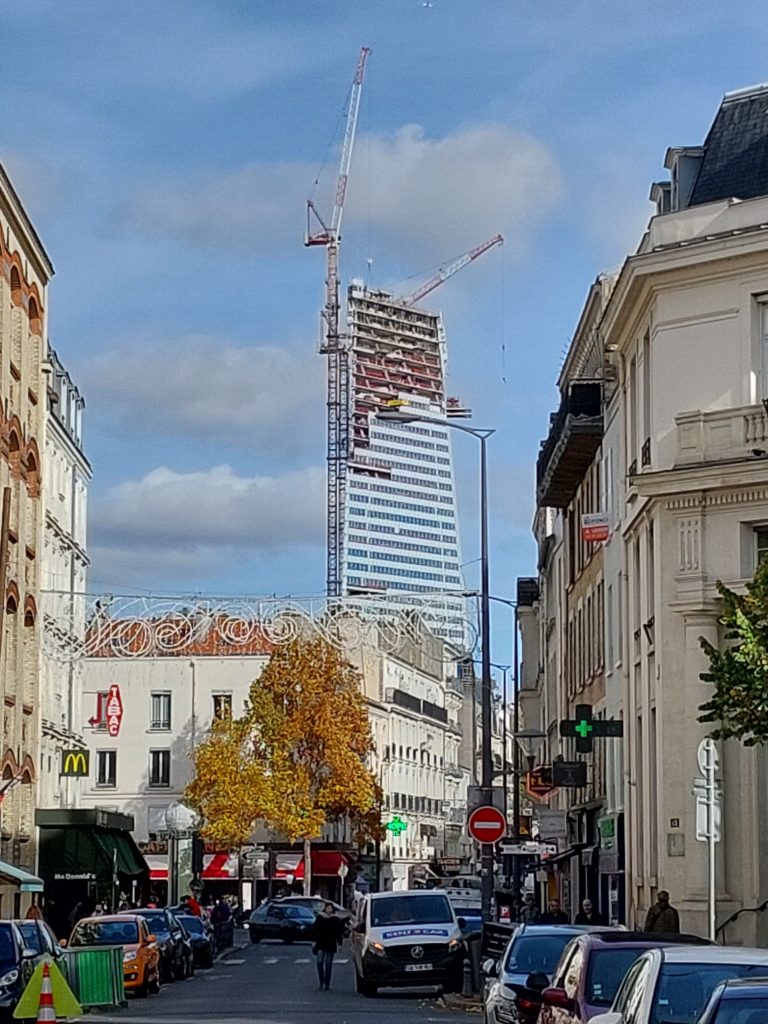 La tour Triangle, un an plus tard (voir l’Echo Val de Seine N° 113 de décembre 2024). Au moment de la photo, 35 des futurs 44 étages étaient déjà construits. Elle n’a donc pas encore fini sa croissance et ses 180 m (30 m de moins que la Tour Montparnasse). La livraison finale serait prévue pour début 2027. Plus besoin des grues pour pouvoir la repérer de Corentin Celton, à Issy-les-Moulineaux. Elle est maintenant immanquablement visible, tel Godzilla au milieu de la ville !