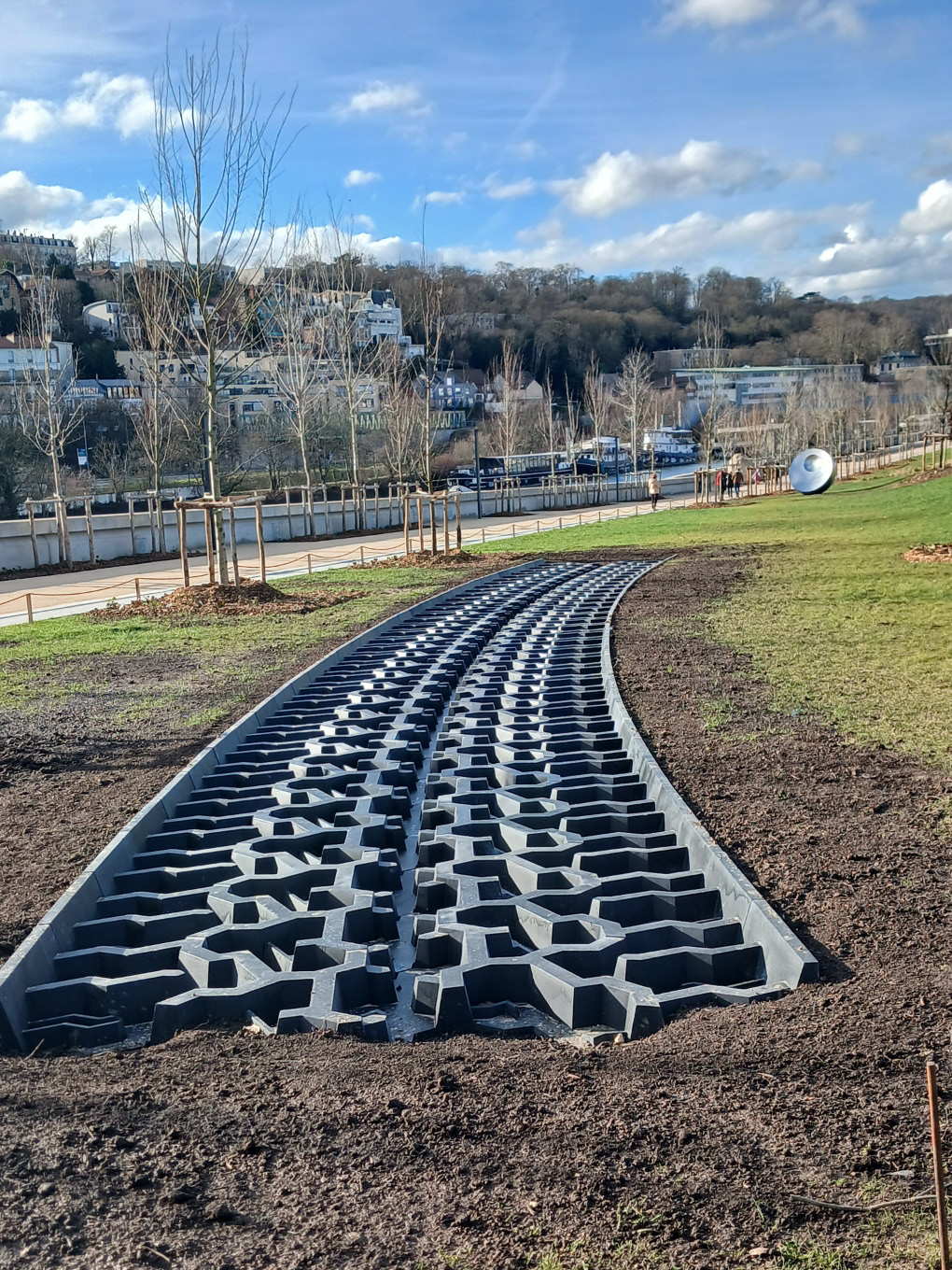 Situé sur la rive sud-est de l’île, face au coteau de Meudon, le parc de 1,5 hectare est composé d’une pelouse en forte déclivité enserrée dans une promenade agrémentée d’œuvres d’art prêtées par la FRAC Île-de-France et la fondation Emerige, qui font de l’île Seguin « le phare de notre vallée de la Culture » d’après le président du Conseil départemental, Georges Siffredi… La promenade sera bientôt reliée aux berges aménagées sur une partie du tour de l’île, en contrebas du parc qui représenteront un hectare supplémentaire accessible aux promeneurs, comme le beau jardin Bellini – mal signalé – situé en haut des escaliers de la Seine Musicale. La partie centrale végétalisée en pelouse et faiblement arborée occupe moins d’un hectare en deux parties (environ 300 m par 30 m de large).